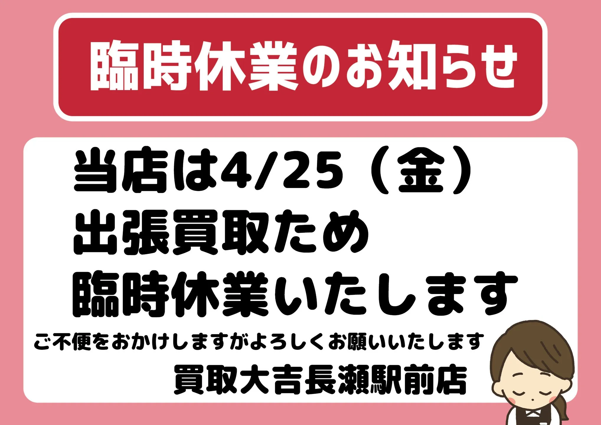 当店は4/25(金)、臨時休業いたします。