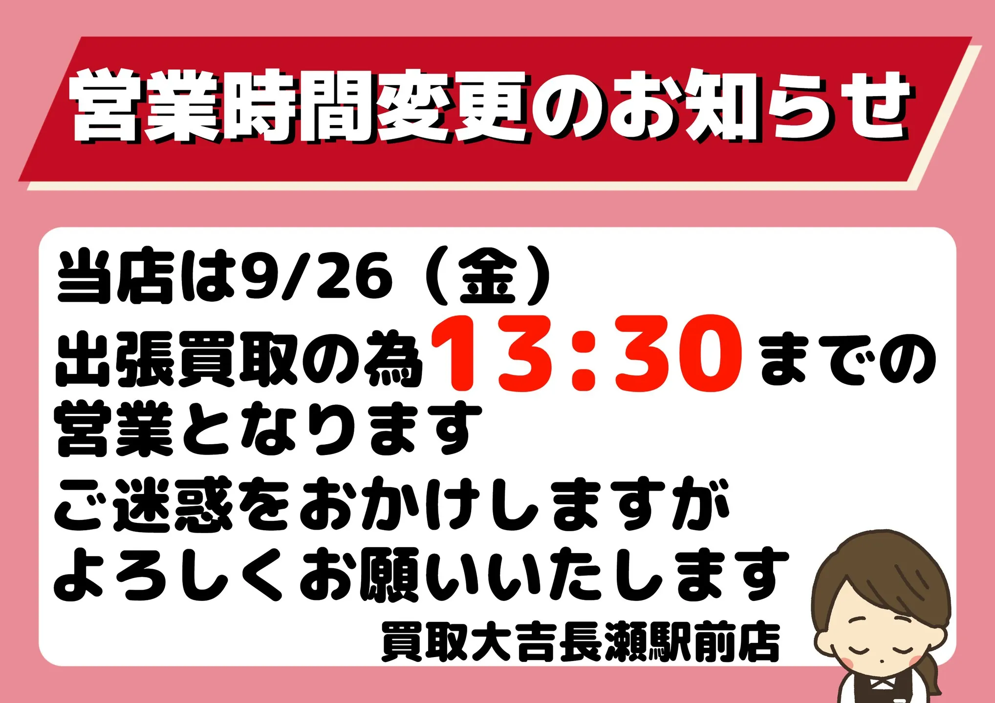 出張買取のため、当店は9/26(金)は13:30までの営業となります。