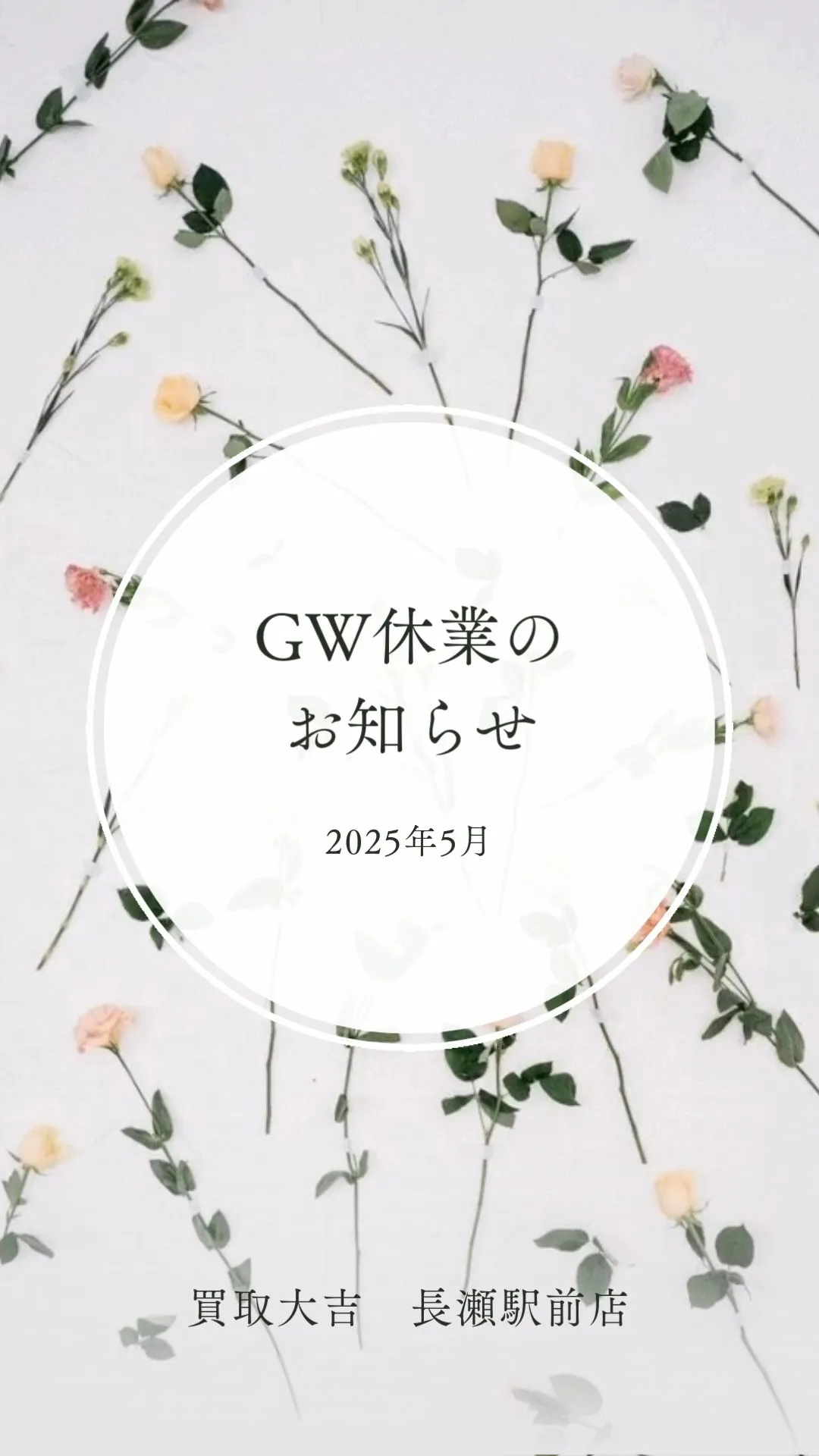【お知らせ】GW休業のお知らせ【臨時休業】 【お知らせ】GW休業のお知らせ【臨時休業】こんにちは、買取大吉長瀬駅前店です!いつも当店をご愛顧いただき、ありがとうございます。誠に勝手ではございますが、当店は明日、5/3(土)~5/6(火)の期…